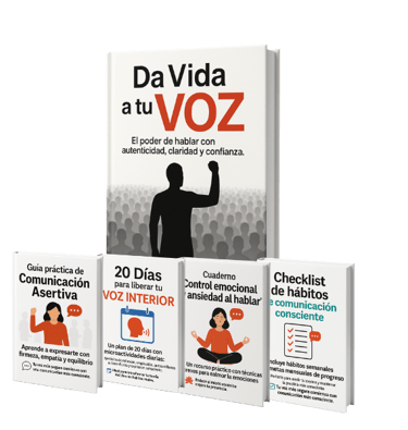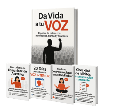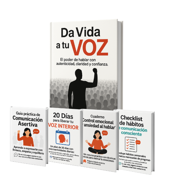 Al adquirir tu ejemplar de DA VIDA A TU VOZ, recibirás 4 regalos complementarias diseñadas para acompañarte paso a paso en tu proceso de transformación personal y comunicativa.
