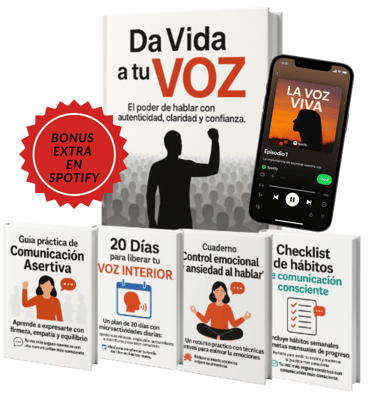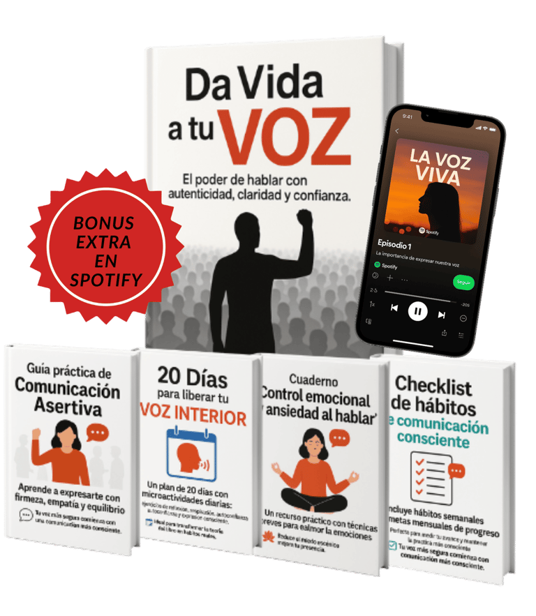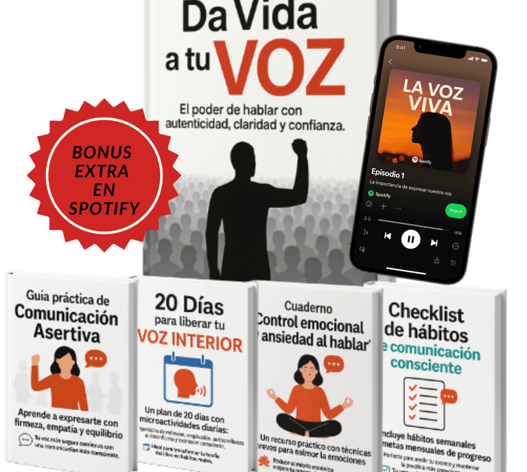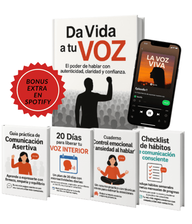 Al adquirir tu ejemplar de DA VIDA A TU VOZ, recibirás 4 regalos complementarias diseñadas para acompañarte paso a paso en tu proceso de transformación personal y comunicativa.